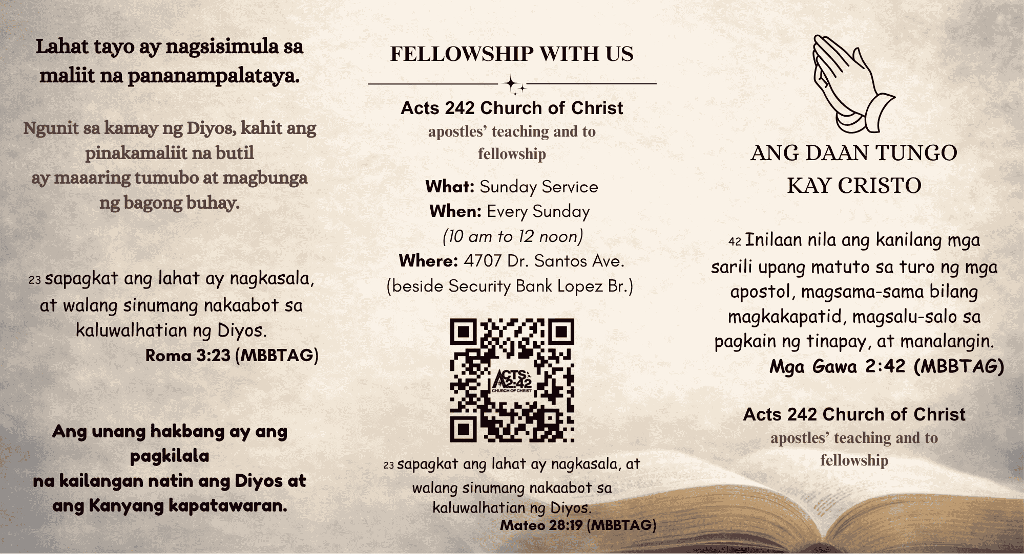 Browse sermonsA gospel trifold in Filipino walking through the truth of sin, God's love, redemption in Christ, new life, and the call to respond. For one-on-one sharing or group outreach.